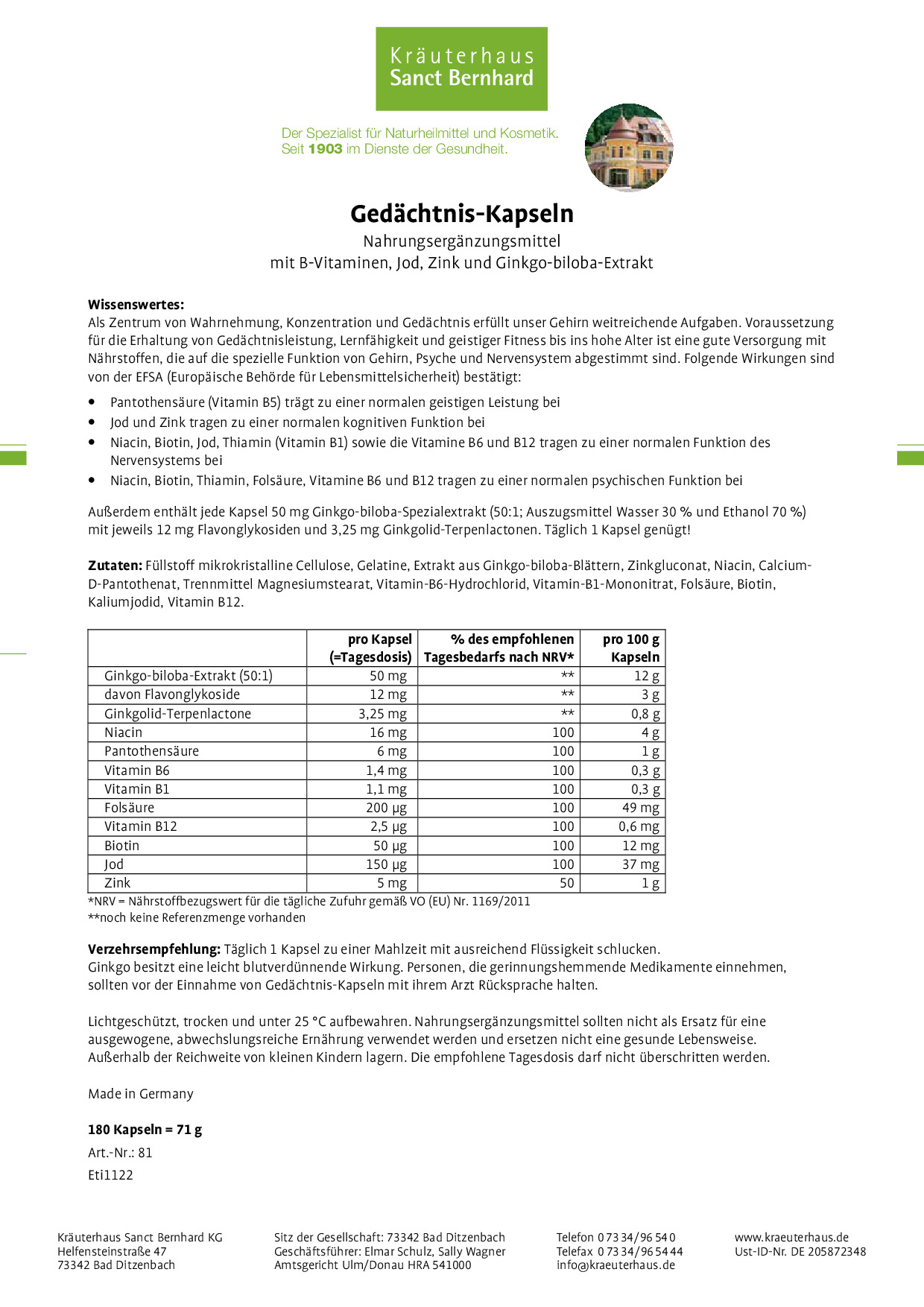 Zutaten: Füllstoff mikrokristalline Cellulose, Gelatine, Extrakt aus Ginkgo-biloba-Blättern, Zinkgluconat, Niacin, Calcium-D-Pantothenat, Trennmittel Magnesiumstearat, Füllstoff Natriumcitrat, Vitamin-B6-Hydrochlorid, Vitamin-B1-Mononitrat, Folsäure, Biotin, Kaliumjodid,  Vitamin B12.