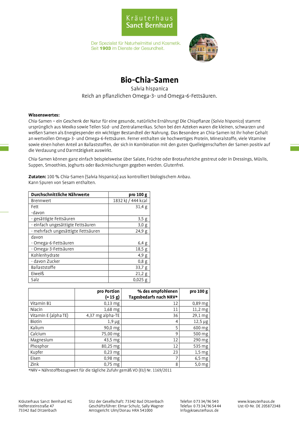 Zutaten: 100 % Chia-Samen (Salvia hispanica) aus kontrolliert biologischem Anbau.