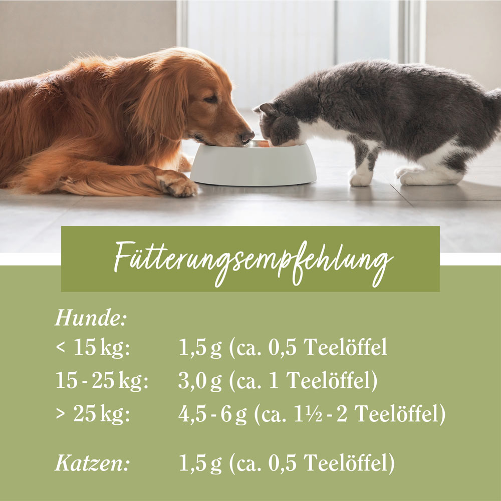 Katzen: 1,5 g (= ca. 0,5 Teelöffel)