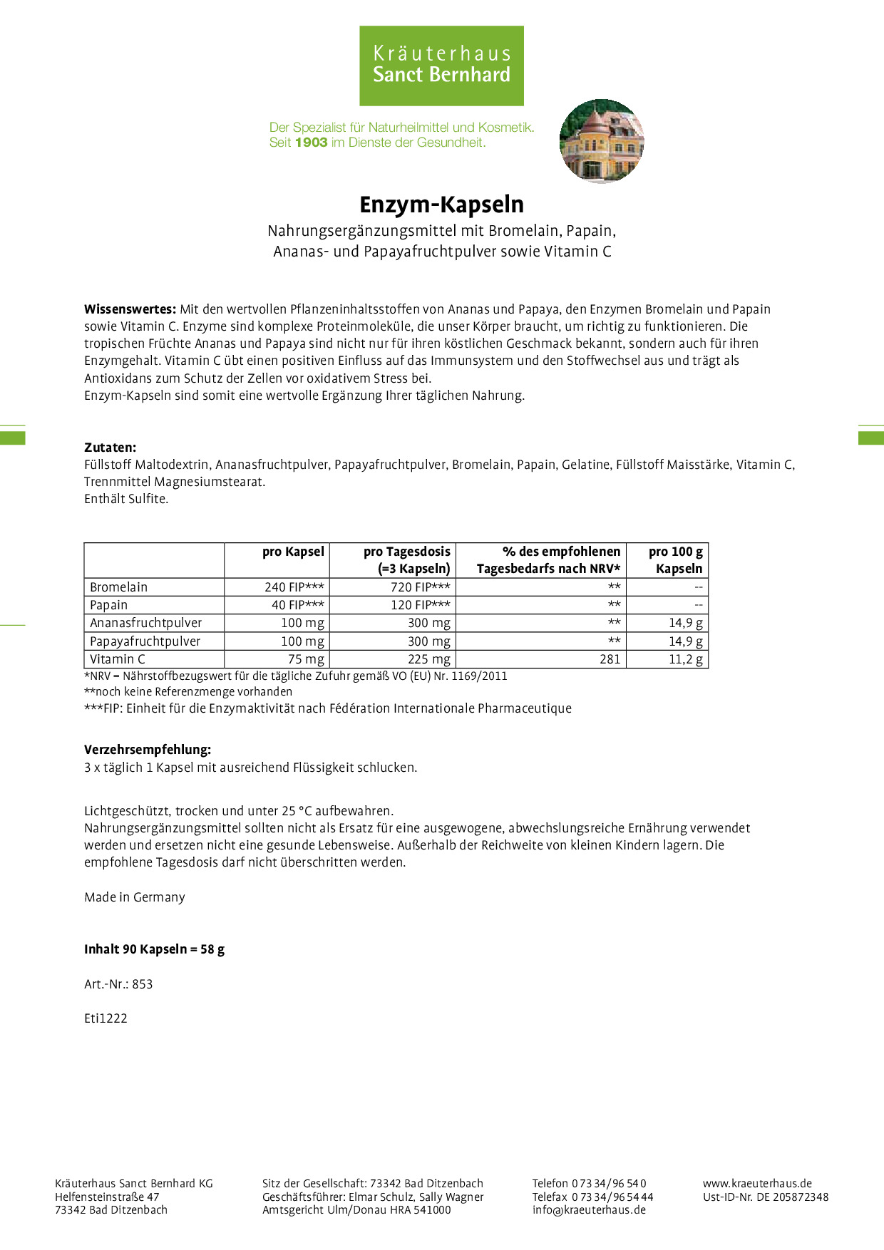 Zutaten: Maisstärke, Ananasfruchtpulver, Papayafruchtpulver, Hydroxypropylmethylcellulose, Vitamin C, Bromelain, Maltodextrin, Papain, Trennmittel Magnesiumstearat.