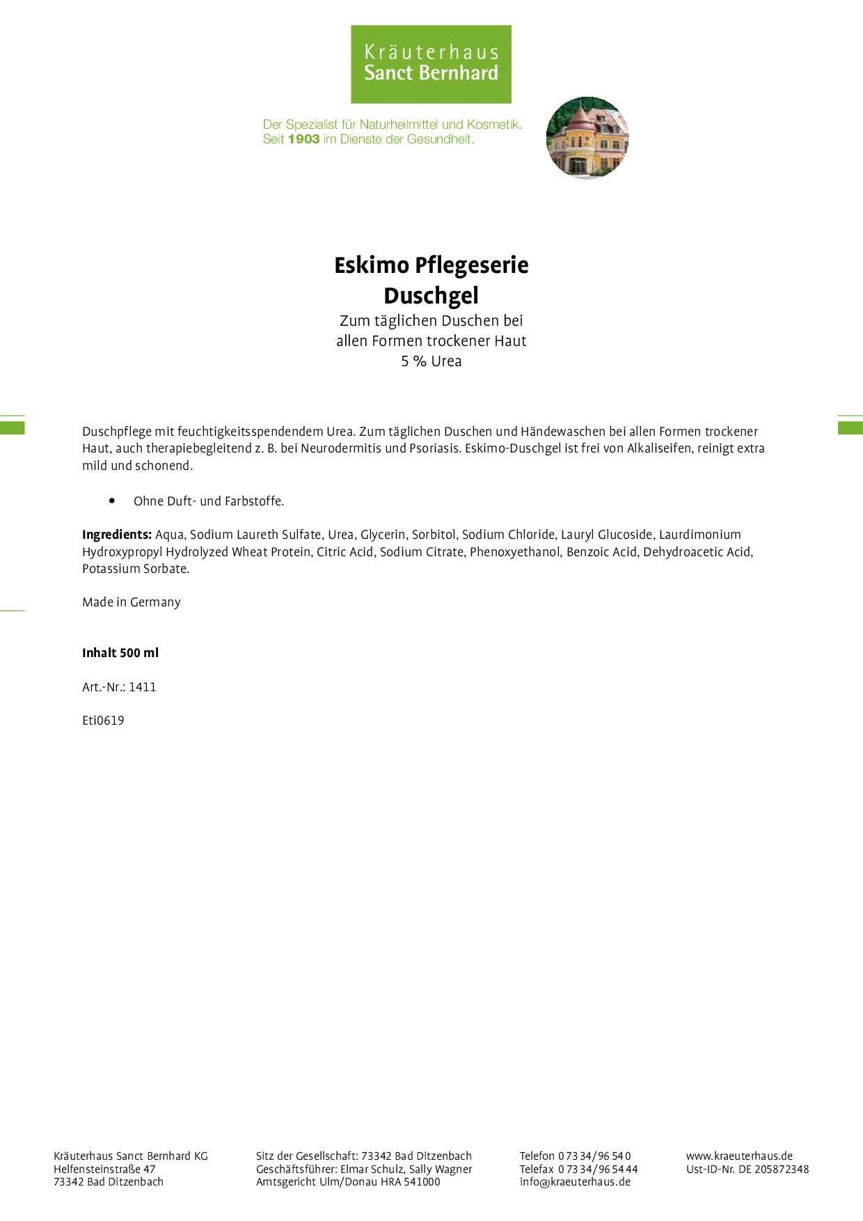 Duschpflege mit feuchtigkeitsspendendem Urea. Zum täglichen Duschen und Händewaschen bei allen Formen trockener Haut, auch therapiebegleitend z. B. bei Neurodermitis und Psoriasis. Eskimo-Duschgel ist frei von Alkaliseifen, reinigt extra mild und schonend. Frei von Duft- und Farbstoffen.